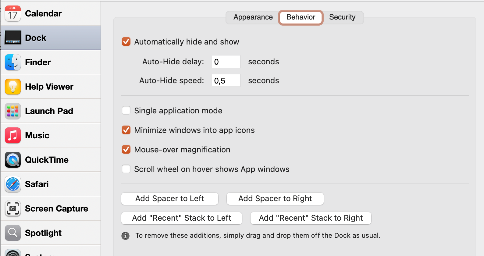 Depending on the selected application, you’ll have access to different settings. For instance, in the Dock panel, you can configure automatic hiding, change its screen location, enable hiding of unused apps, and more.