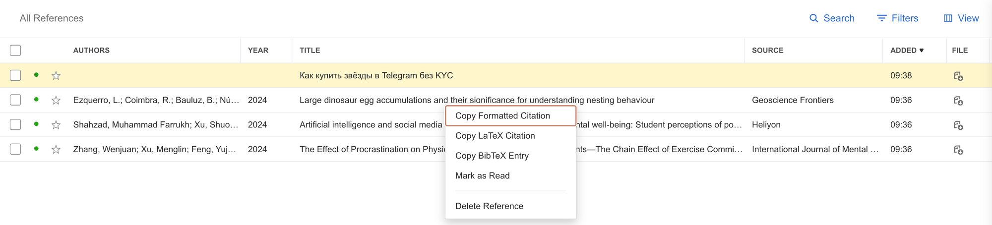 From this panel, you can quickly copy citations in LaTeX, BioText, or plain text formats. Additionally, you can enrich sources with extra information like city, language, page count, and more.