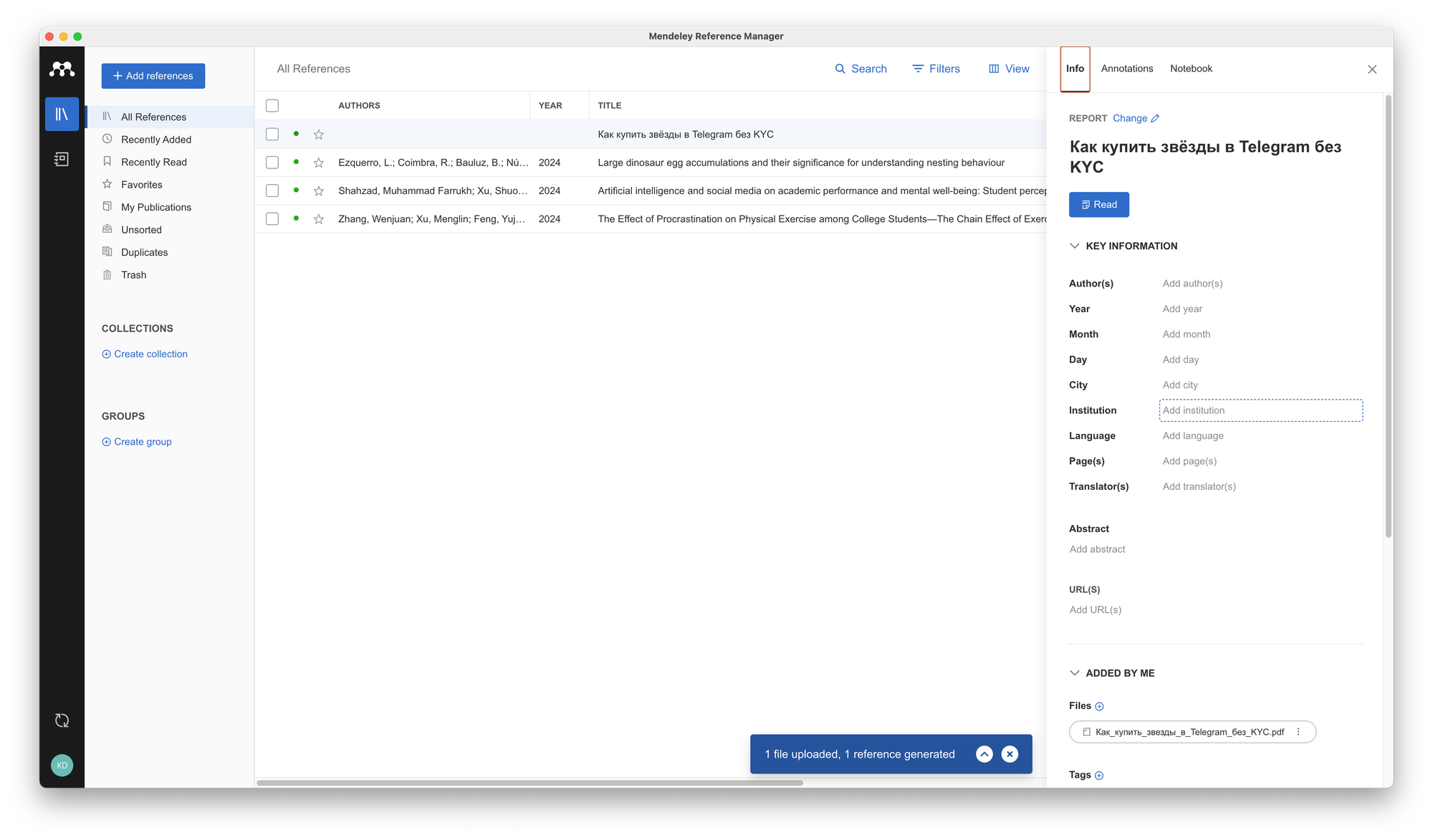 However, if these features meet your needs, Mendeley does an excellent job at managing references efficiently.