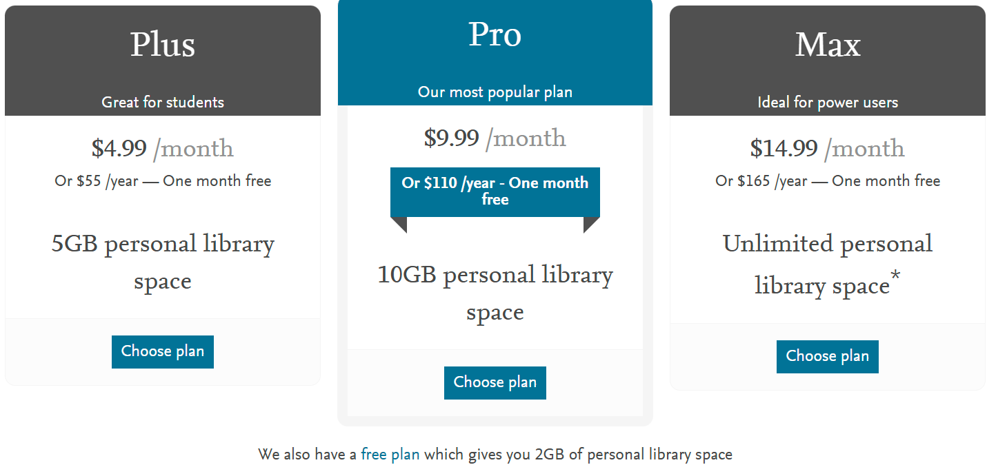 Mendeley is free if your database doesn’t exceed 2 GB. Paid plans start at $4.99 per month, differing only in available storage capacity.