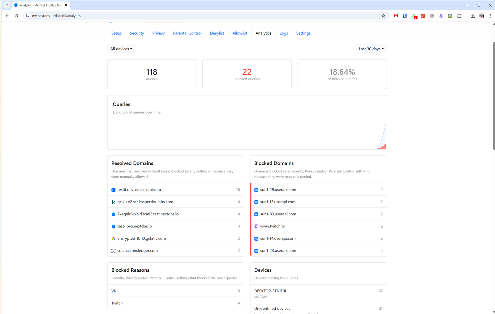 These sections display detailed stats on how NextDNS is performing. You can also see which devices are visiting which sites and take further action if needed.