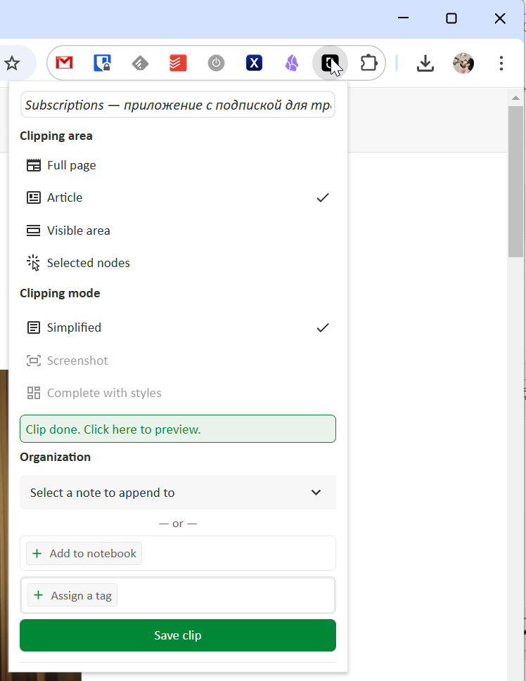 The clipper is available for Chrome and Firefox browsers, but to use it fully, you need to have an account.