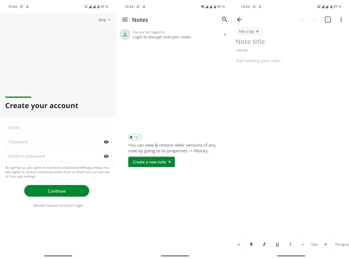Upon first launch, Notesnook gives you the option to either register with an email address or start using the app right away. If you want data synchronization with the server and encryption for your notes, registration is necessary. Otherwise, the app can be used without an account.