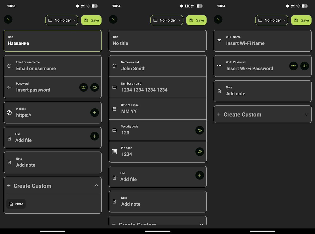 The manager allows you to store passwords, app authentication codes, credit card details, Wi-Fi credentials, passport data, notes, and other information.