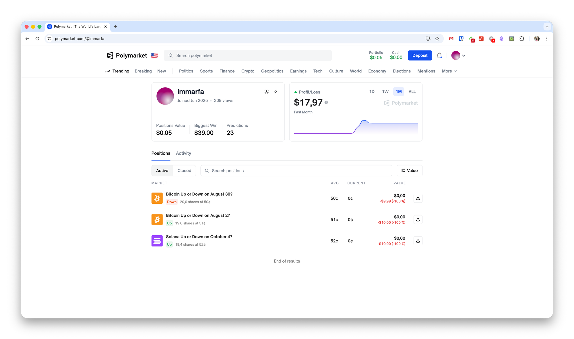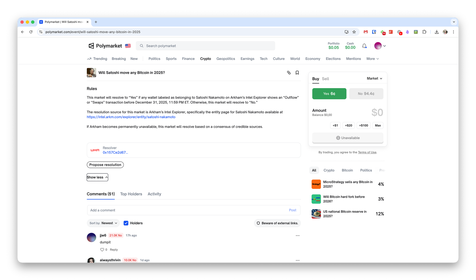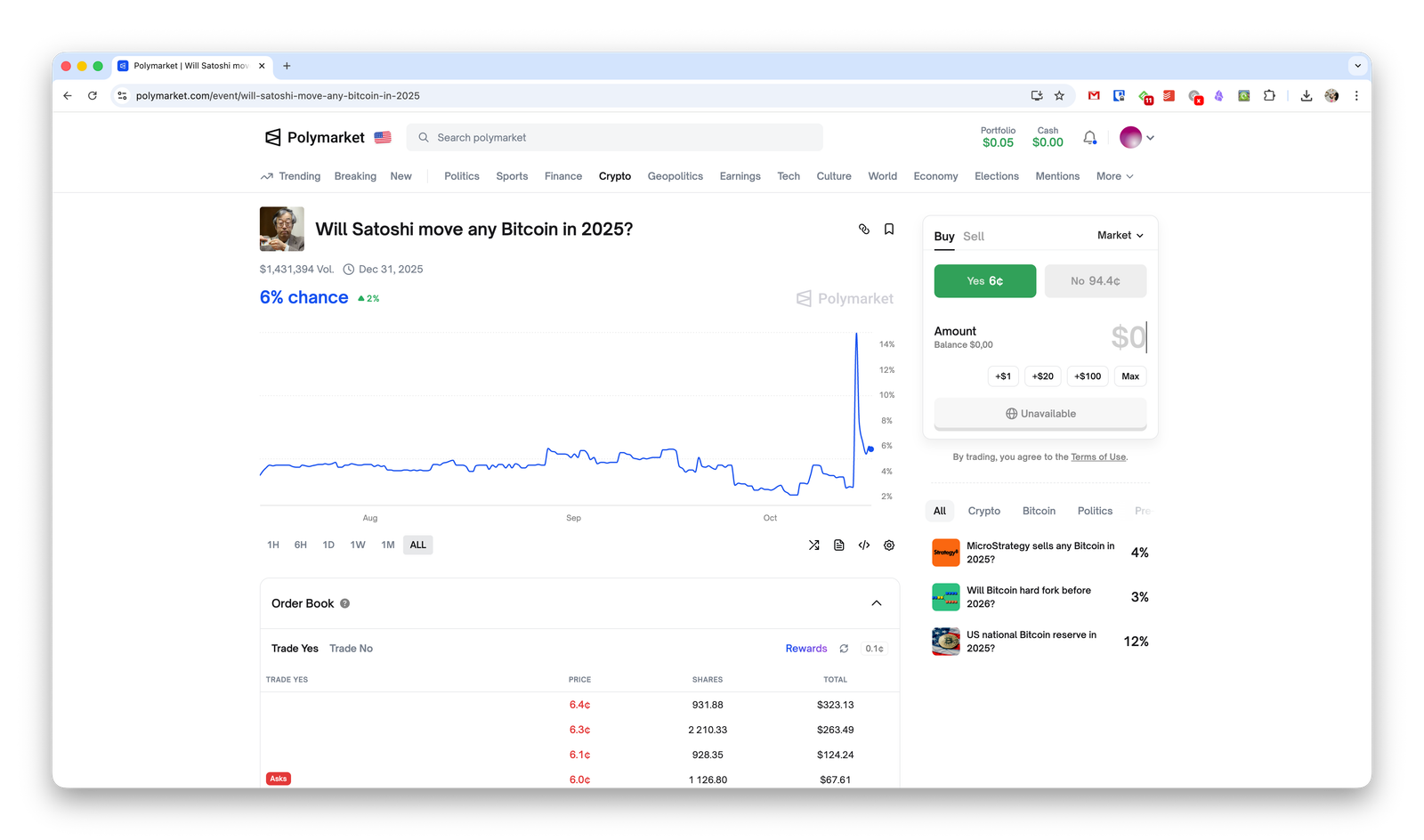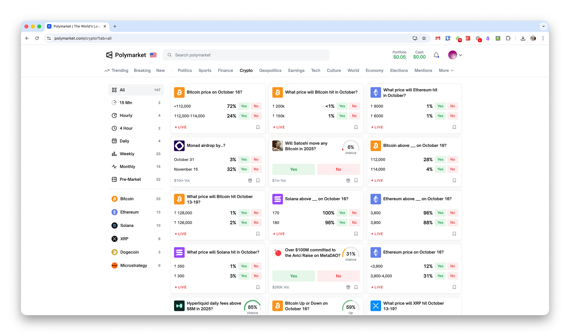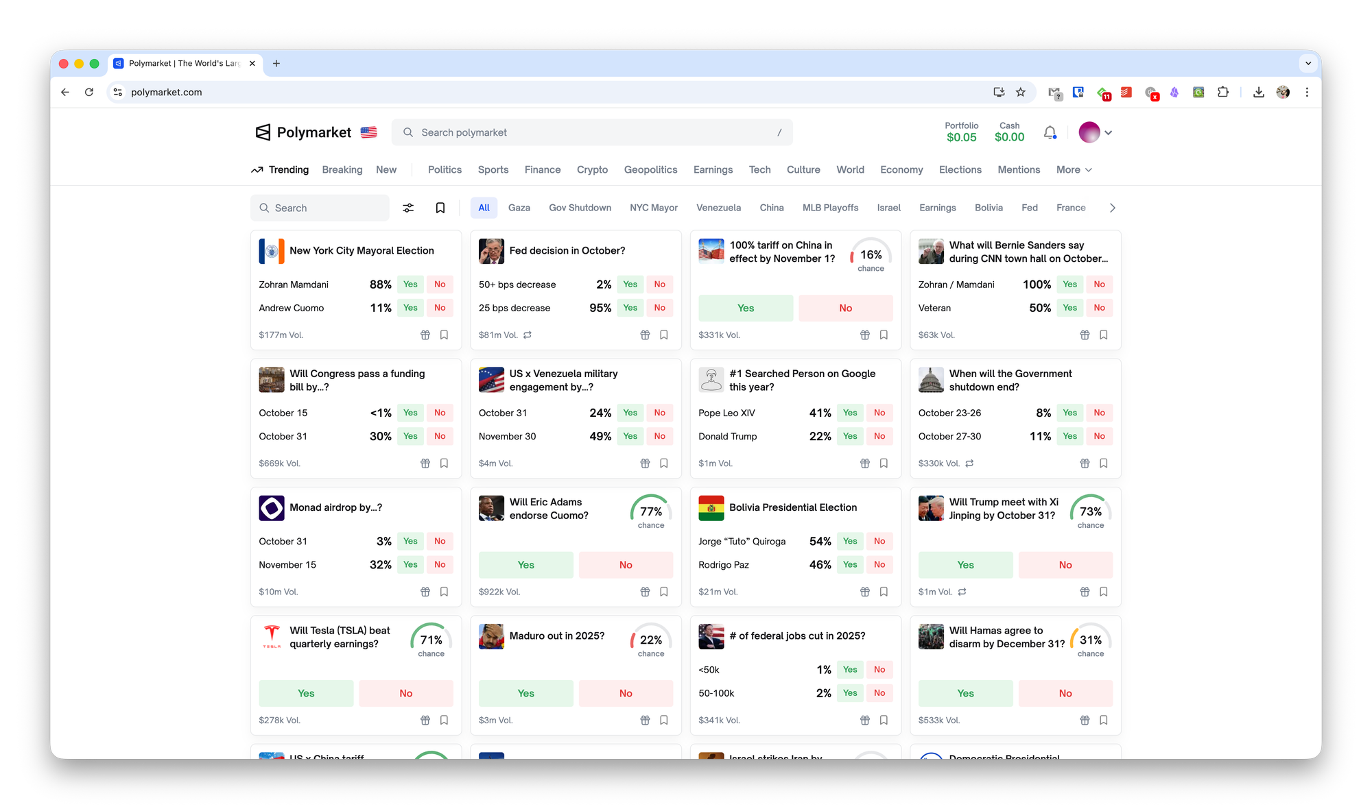- Navigation – You can search directly or select a category that interests you. Popular categories include Politics, Finance, Crypto, Mentions, and more.