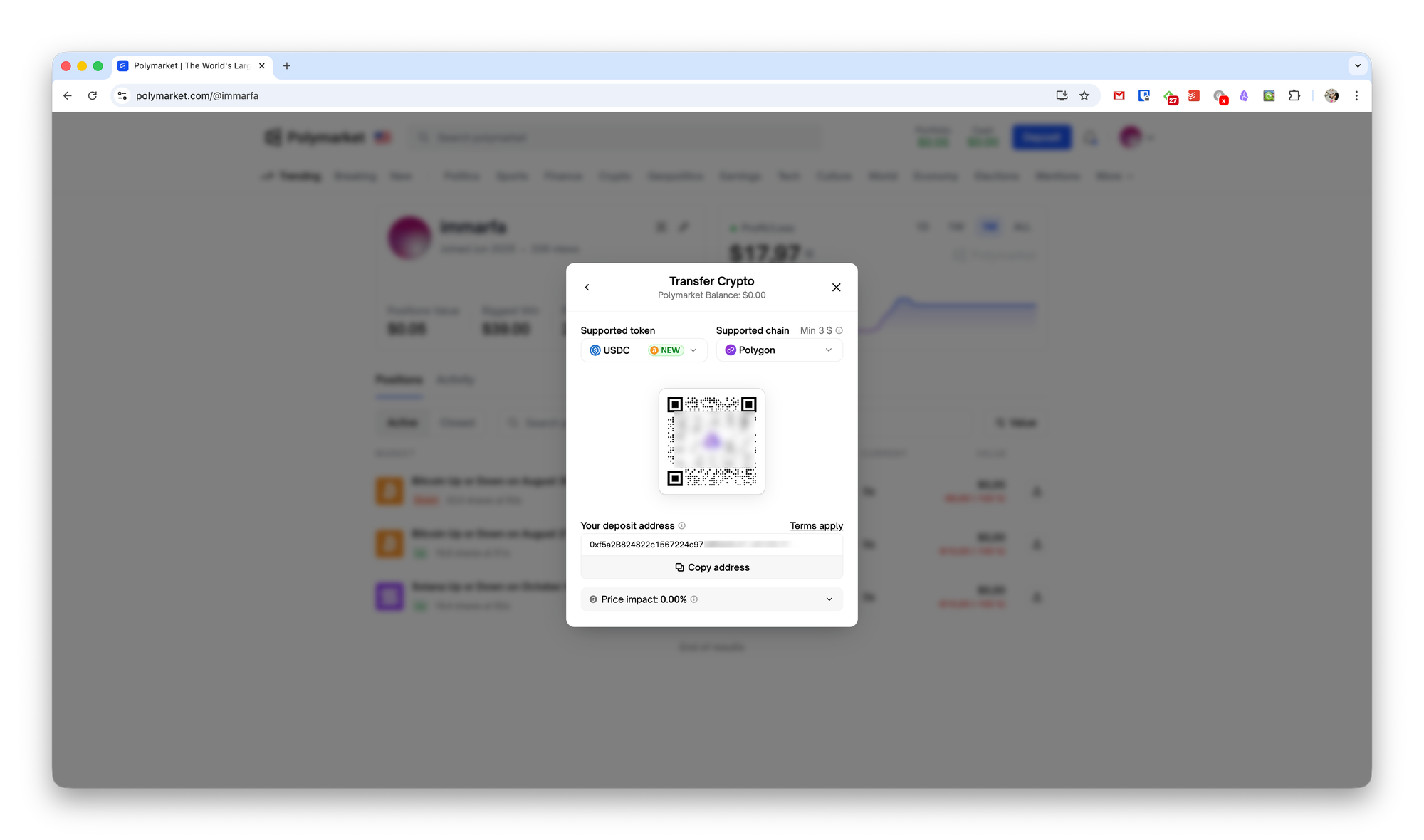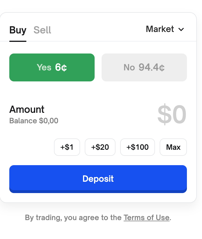 - Deposit: Click the button in the top‑right corner to top up your Polymarket wallet.