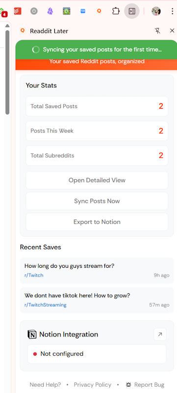 When you first launch the extension, you’ll need to grant access to Reddit and then wait a bit for all your saved posts to fully sync.