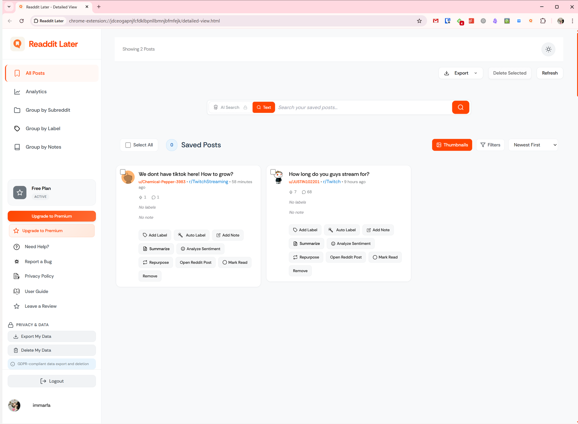 You can add labels to posts (manually or automatically), attach notes, generate summaries and analyses, and reuse content. However, clicking on a card opens the original Reddit post. That means there’s no true offline storage unless you’ve enabled the Notion integration.