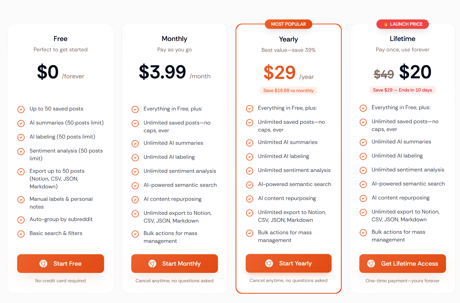 You can use Readdit Later for free if you store no more than 50 posts. All features are available, but with the same limit.