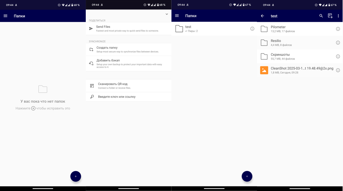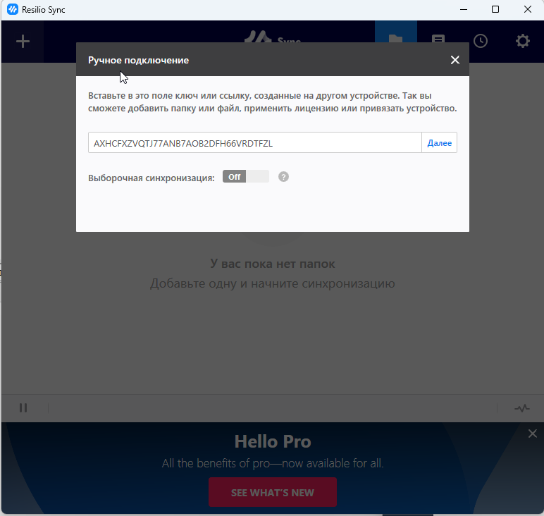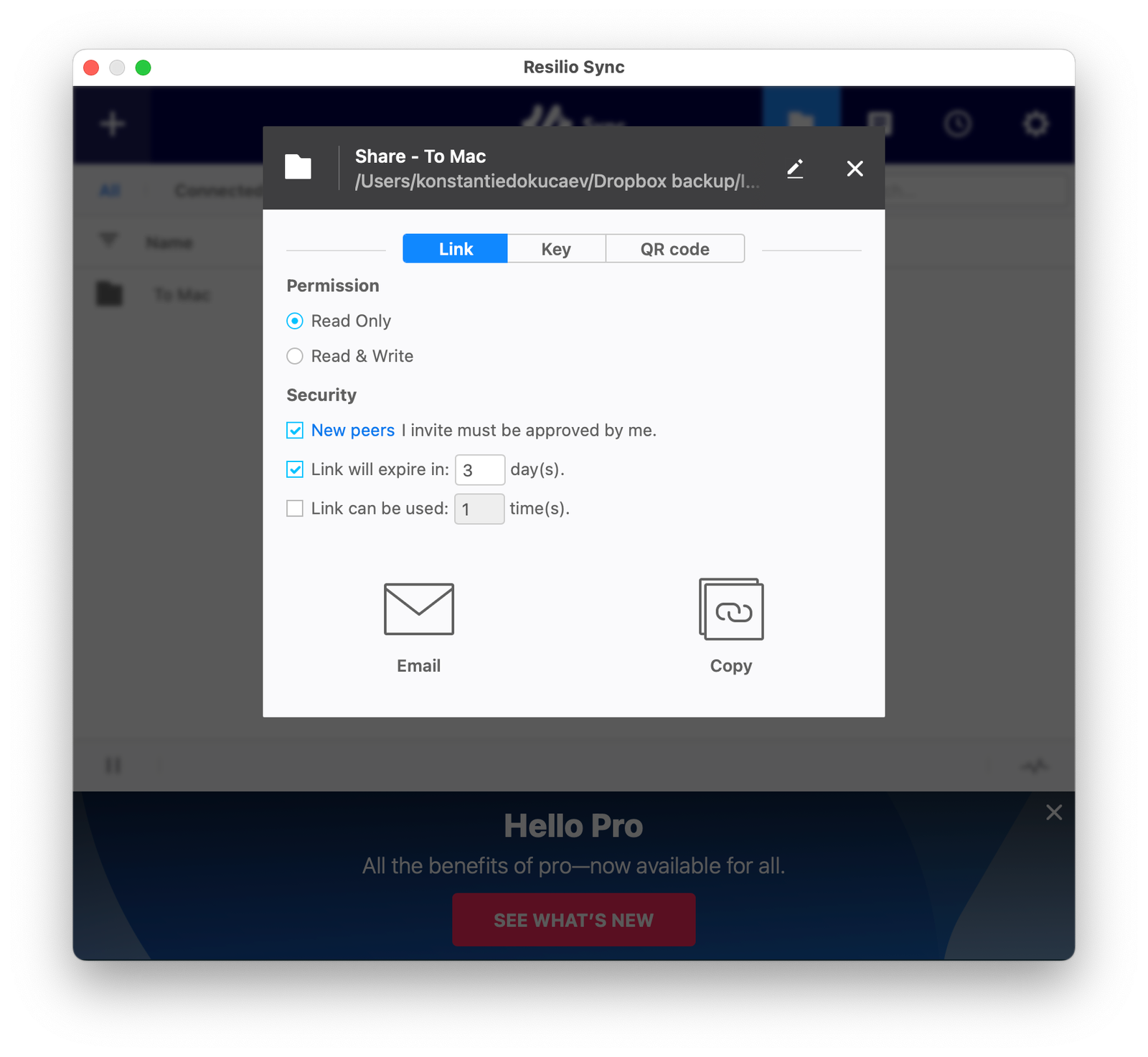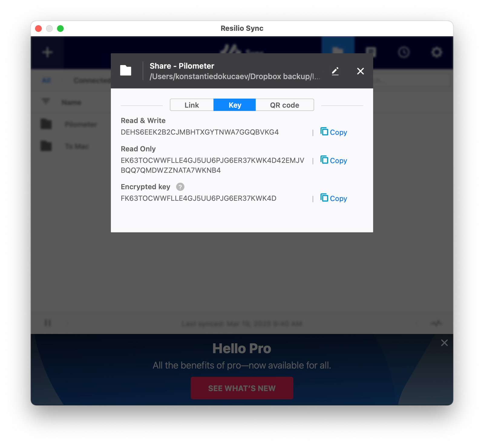 Sync doesn’t require an account. To access a folder on other devices, you need to obtain a link, key, or QR code. In all three cases, you can choose the desired access type.