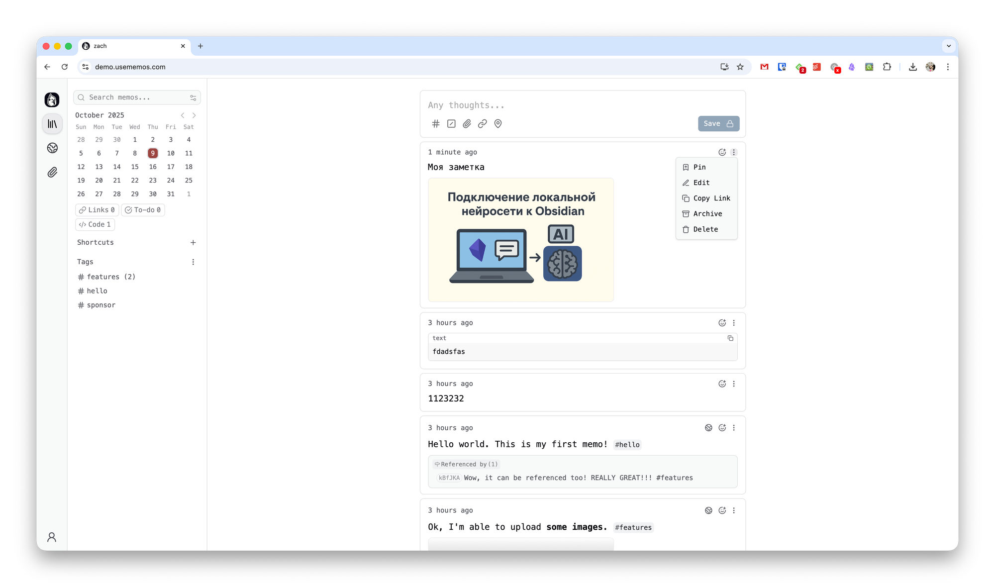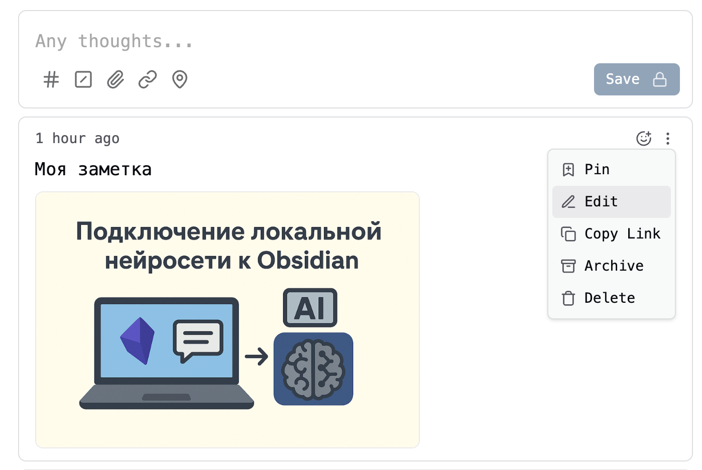 Formatting is provided via Markdown. A finished note can be pinned, linked to, archived, or deleted.
