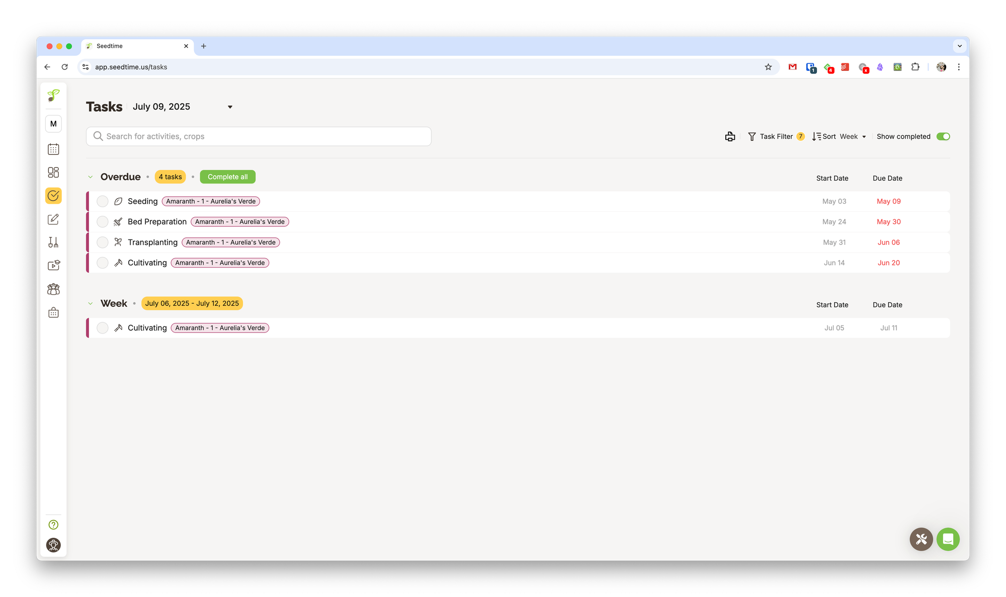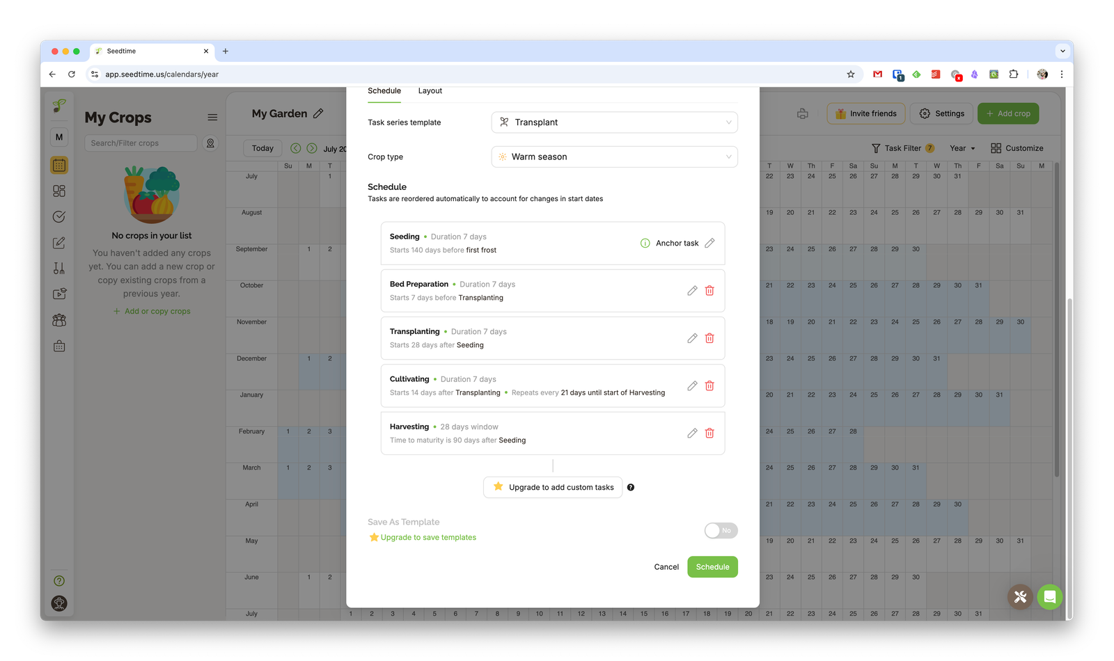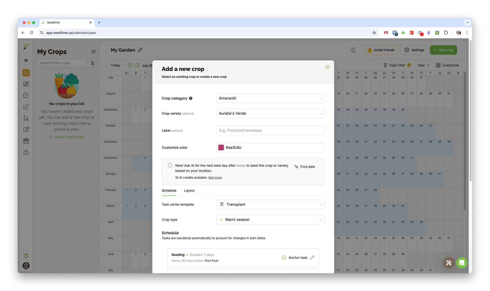 In the example above, I create a task to plant amaranth for the warm season. Seedtime auto-generates the list of tasks and planting schedules, but you can add or edit them as needed.