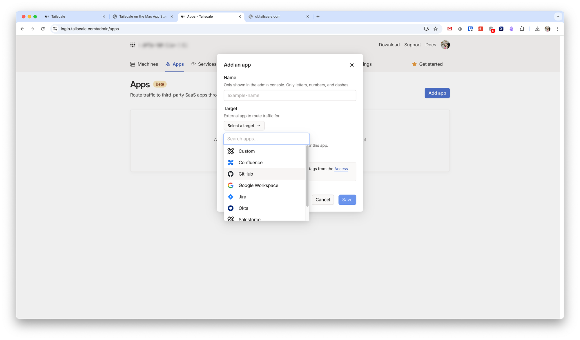 This section allows traffic routing based on application-specific rules, such as Jira, GitHub, Salesforce, or Stripe. While the list is small, you can add custom apps if needed.