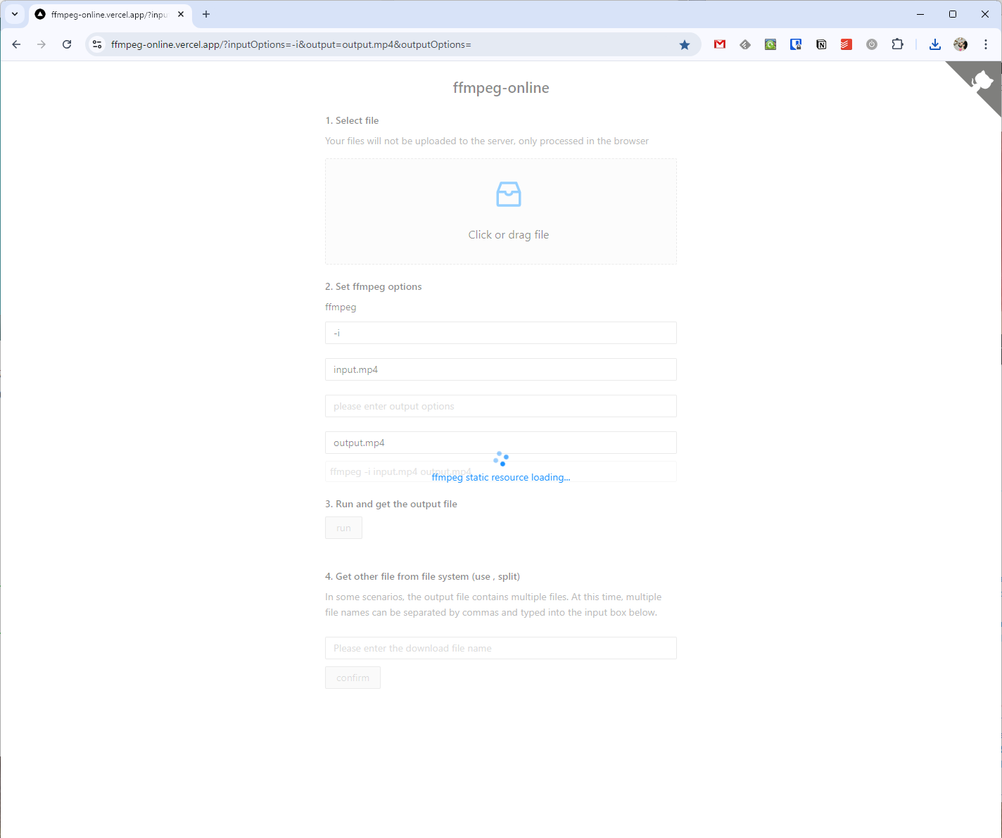 As the name suggests, this is an online converter based on FFmpeg. However, as you can see from the screenshot, it didn't work for me. It seems the service doesn’t simplify working with FFmpeg much unless you're already familiar with it. You’ll need to specify processing parameters manually for successful operation.