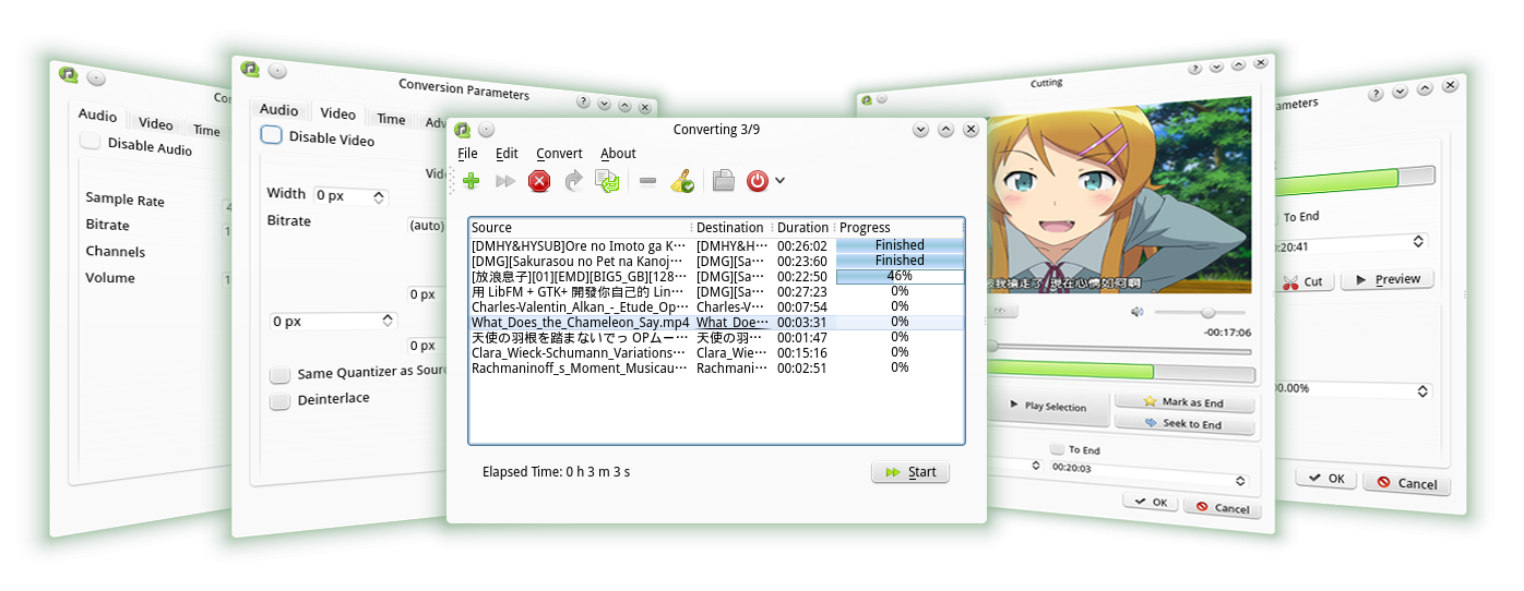 This utility is written in Qt4/C++ and is available for Windows and some rare GNU/Linux systems (even OS/2). It’s a graphical frontend for FFmpeg, providing easy access to all its functions through a user-friendly interface.